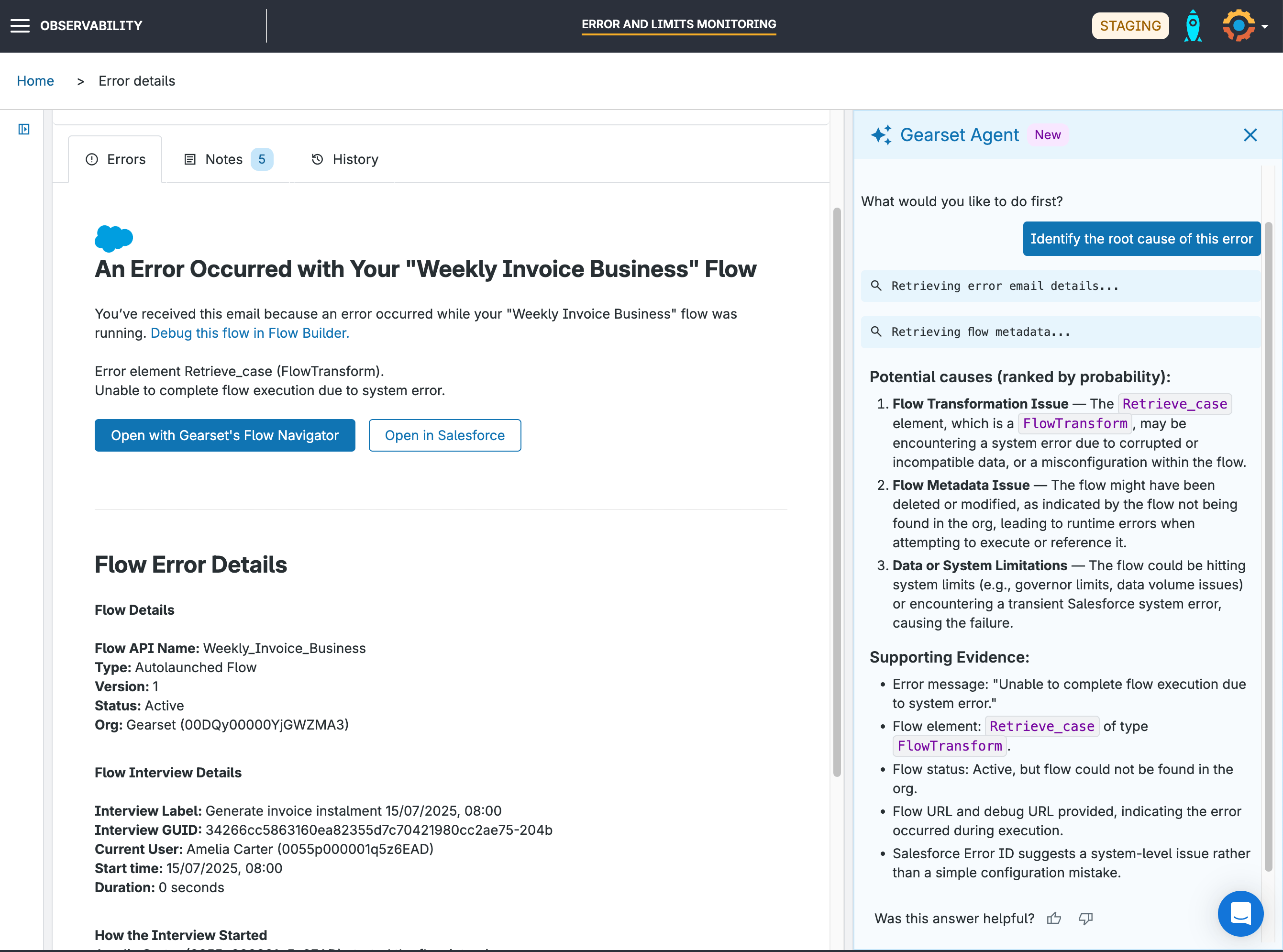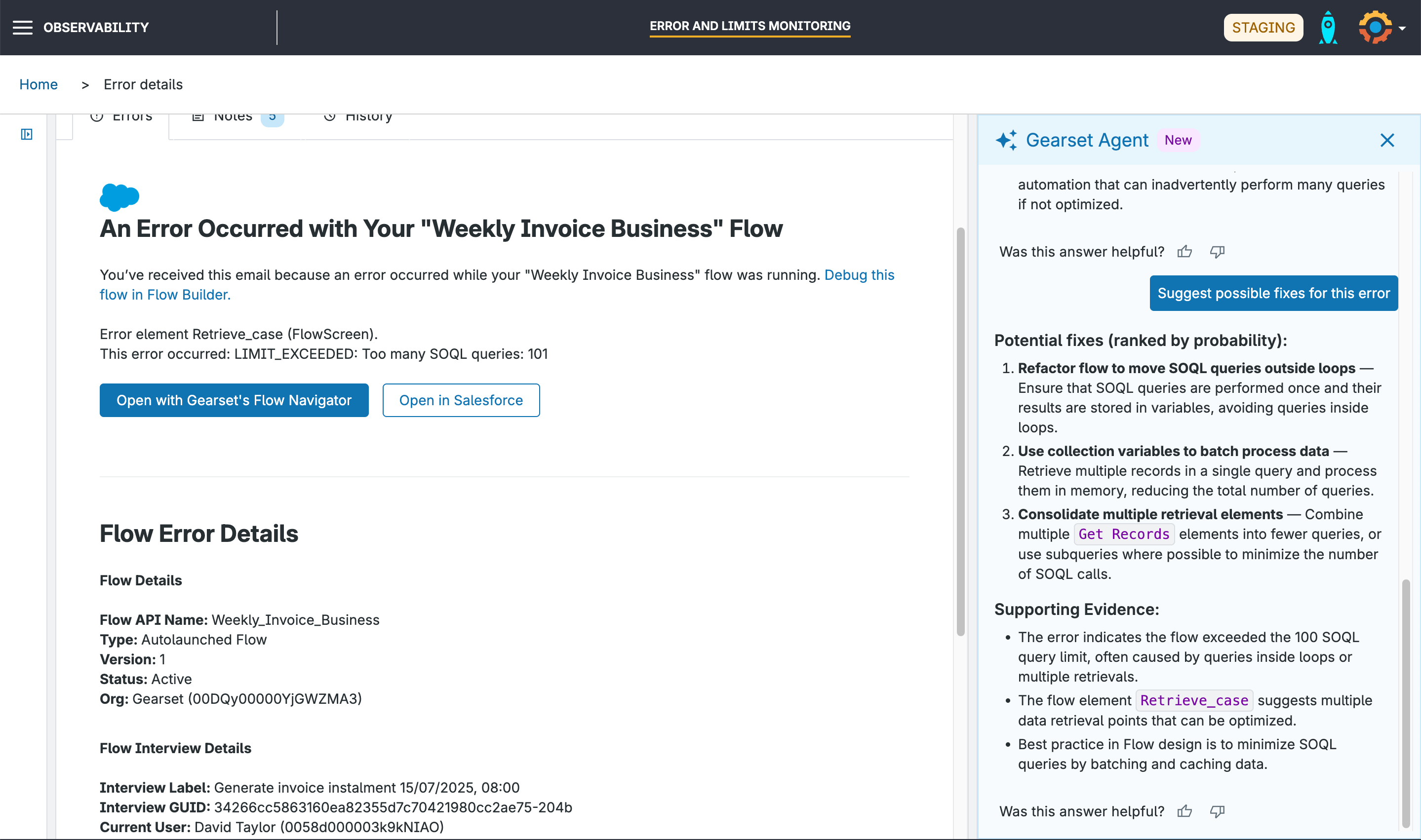That’s where the Gearset Agent can help. The Agent comes built-in to the Observability platform and feeds directly from the Flow metadata and metrics within your org. When a Flow error happens, it gives you instant insight into three core questions: