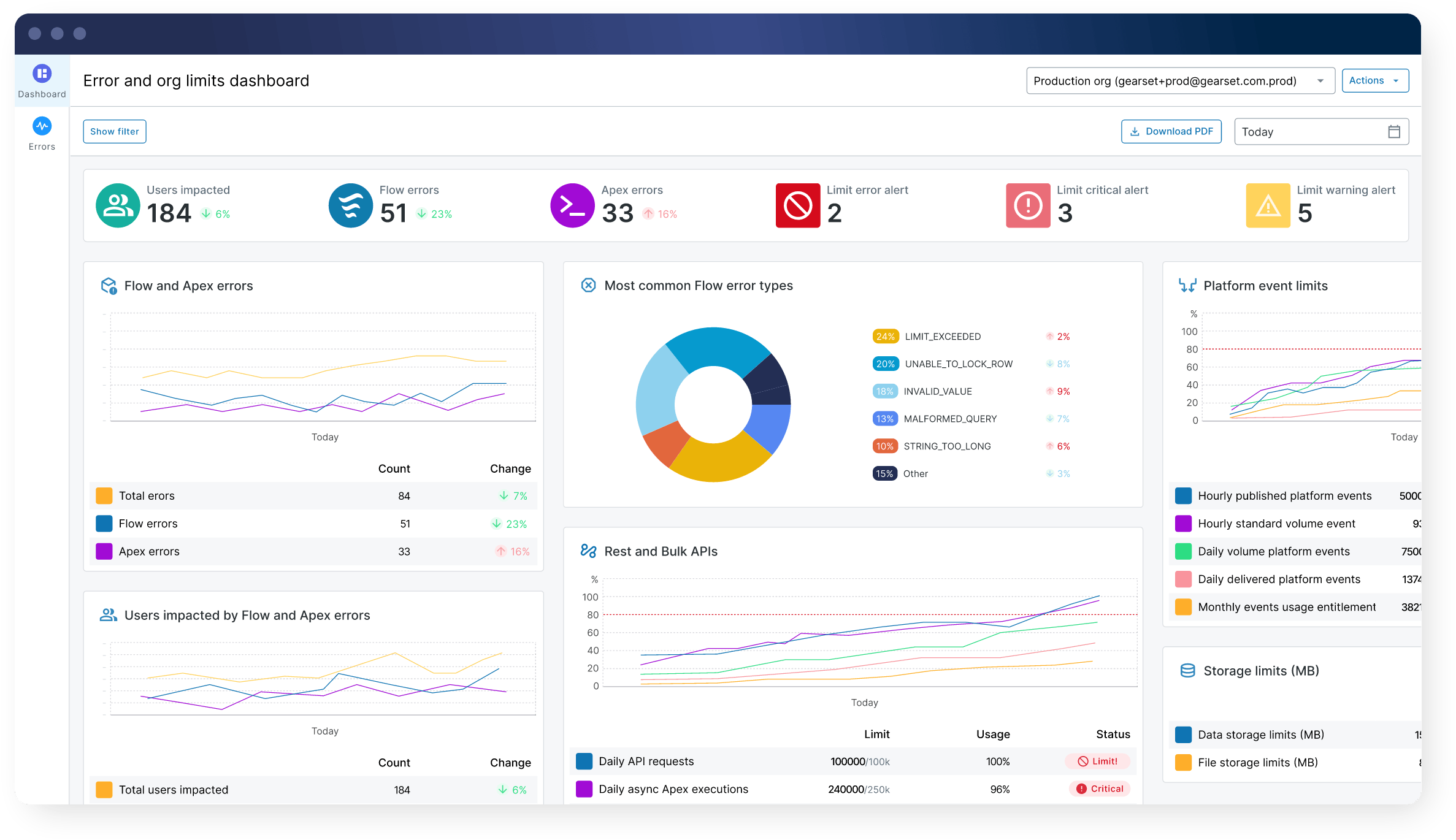 When something breaks in Salesforce, the process of finding and fixing the issue should be simple. Gearset’s Observability solution brings Apex and Flow errors, along with Salesforce org limits (such as daily API requests), together into a centralized, user-friendly dashboard with real-time updates. Here you can visually track your org’s health over time, letting you easily catch issues early, spot any trends quickly, and understand their impact at a glance. It also helps you categorise and prioritise fixes or make strategic decisions based on what has the biggest impact on your org health — without needing to sift through error emails or wait to find out about an issue from your end users.