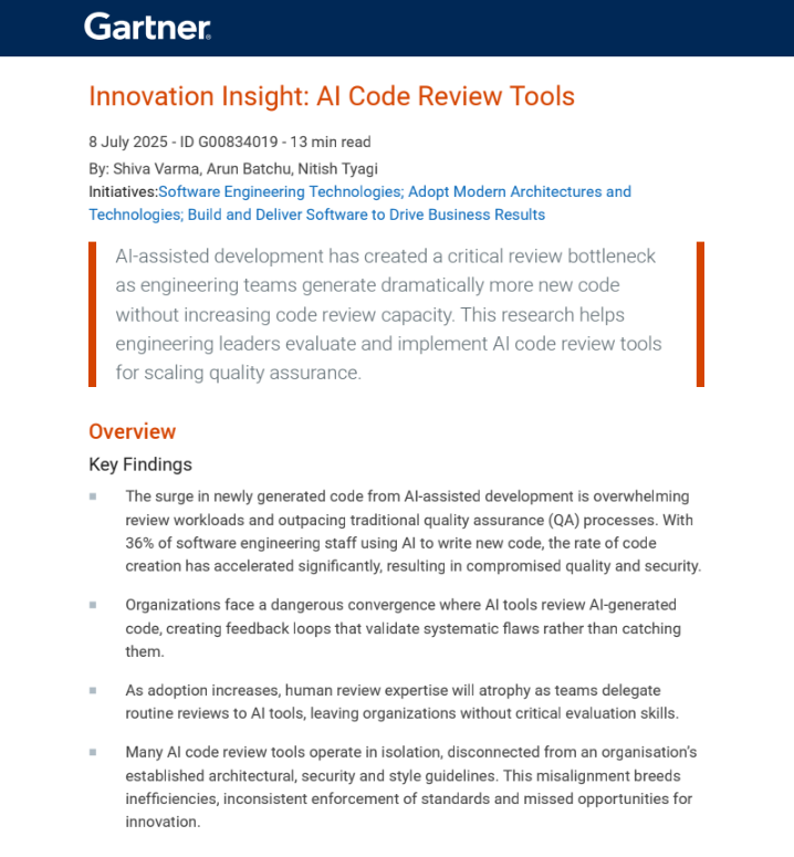 In our view, this Gartner research report helps engineering leaders evaluate code review approaches that keep pace with AI, and ensure quality and security at scale.
